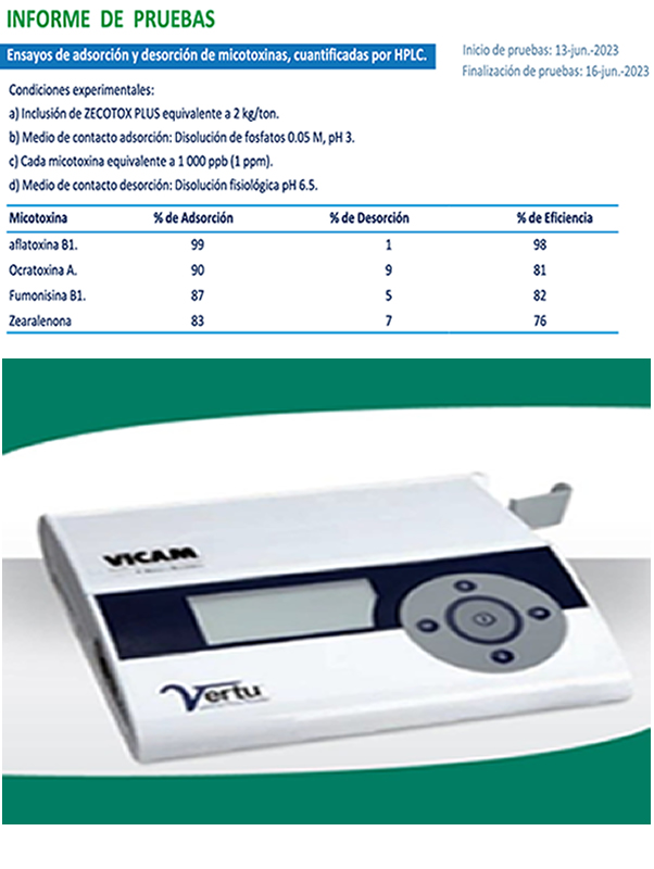 ZECOTOX PLUS® es un adsorbente de amplio espectro formulado con varios ingredientes, cuya función principal es la adsorción de micotoxinas además de obtener beneficios adicionales con ciertos aditivos como el protector hepático, los mos que adhieren bacterias patogenas como salmonella sp. y E. colli. Y otros para control de enterotoxinas, protección del organismo de daño oxidativo reduciendo la producción de radicales libres.