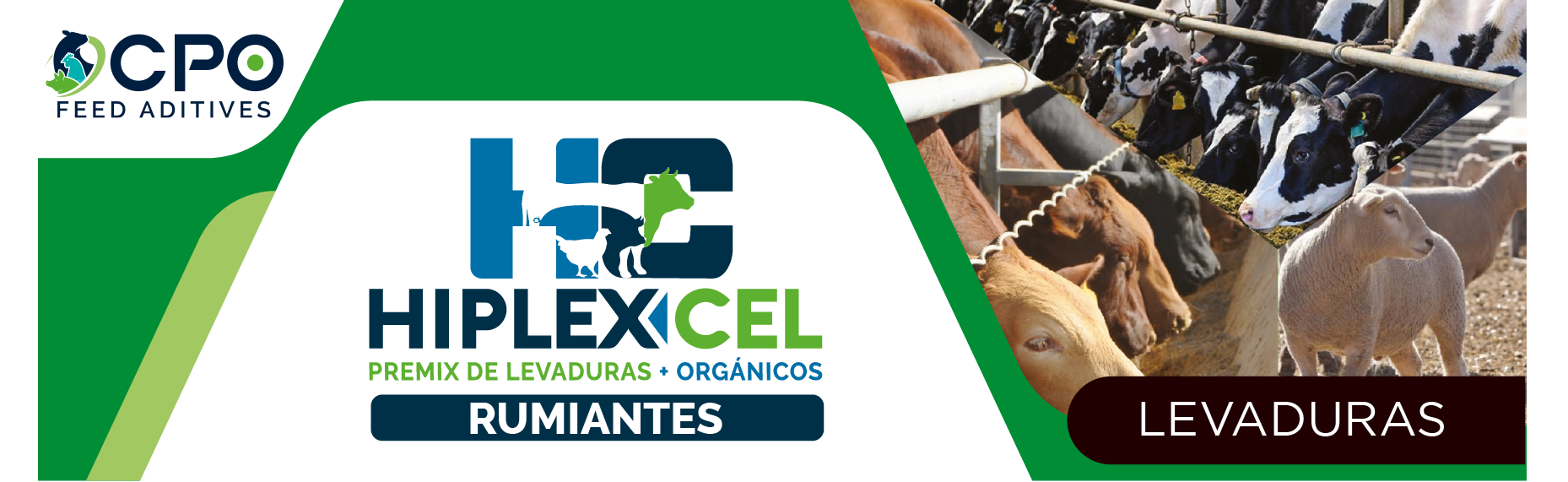 HIPLEX-CEL RUMIANTES es un aditivo compuesto y multifuncional elaborado con levaduras vivas (Saccharomyses cerevisiae), cultivos de levadura, paredes celulares, y algas marinas como buferizante.