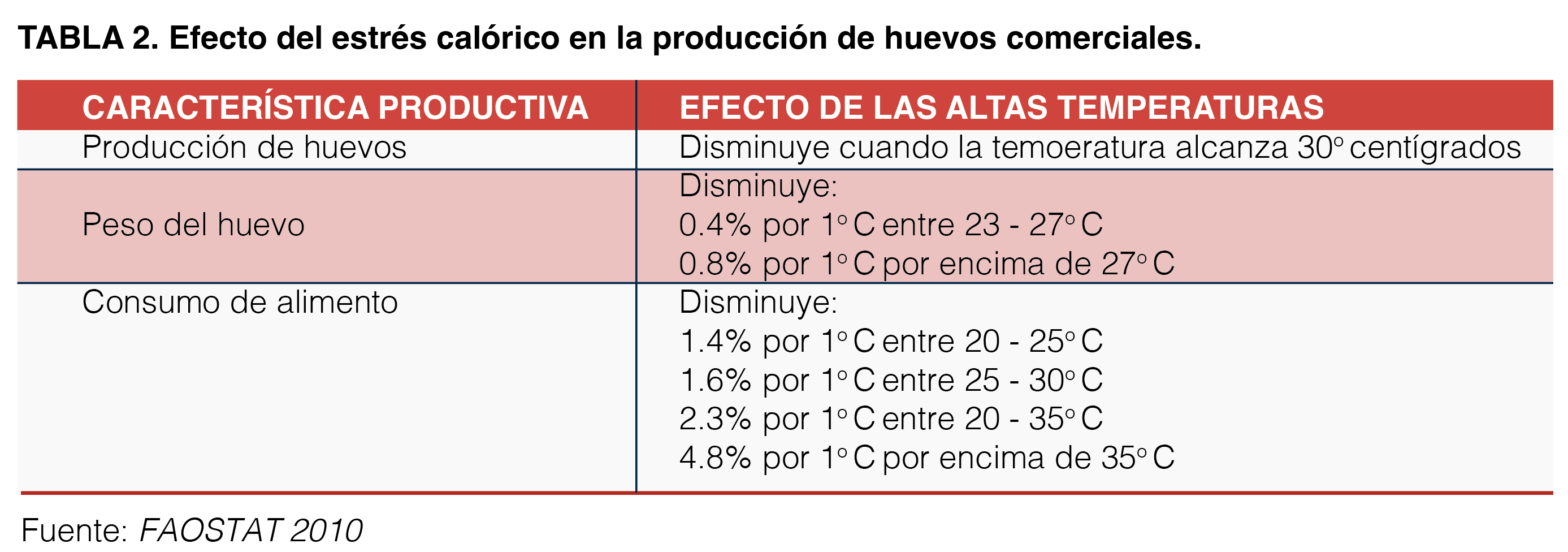 Estudios recientes (Sohail et al. 2012) en pollos de engorda en condiciones de estrés calórico tuvo una reducción significativa en consumo de alimento (-16.4%), Bajo peso (-32.6%) conversión alta de alimento (+25.6%) a los 42 dias de edad.